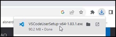 When the download has completed, Select the downloaded files icon on the top left of your browser. when the menu drops down select the VSCodeUserSetup-x64-xxx.exe file you just downloaded, to start the install.